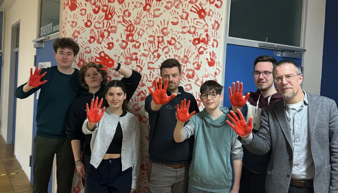 Red Hand Day – SV der Gesamtschule Konradsdorf und Landtagsabgeordneter Patrick Appel (mitte) setzen Zeichen gegen den Einsatz von Kindersoldaten. Bildquelle: P. Appel