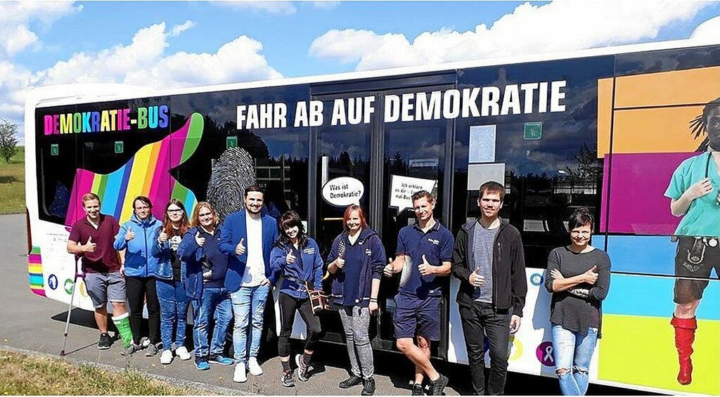 Während eines Workshops in den Herbstferien haben sich Jugendliche und junge Erwachsene mit dem Thema Demokratie beschäftigt. Ihre Ideen wurden im wahrsten Wortsinn auf Folien übertragen, die auf drei Wetterauer Buslinien aufgebracht wurden. Präsentiert werden zwei dieser „Demokratie-Linienbusse“ am Freitag, 15. Januar, um 10.30 Uhr in Friedberg, auf dem Parkplatz am Burgfeld vor dem Jugendzentrum Junity, Burgfeldstraße 19.