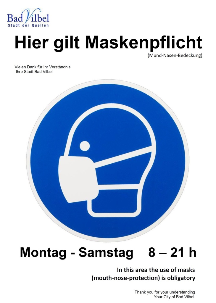 Auf Hinweise der Stadt Bad Vilbel hin hat der Wetteraukreis eine neue Verordnung zur Bekämpfung des Coronavirus‘ erlassen. Diese gilt ab Samstag, den 7. November und sieht eine Pflicht zum Tragen einer Mund-Nasen-Bedeckung („Maskenpflicht“) auf belebten Straßen und Plätzen vor.