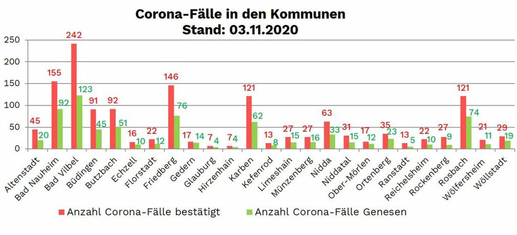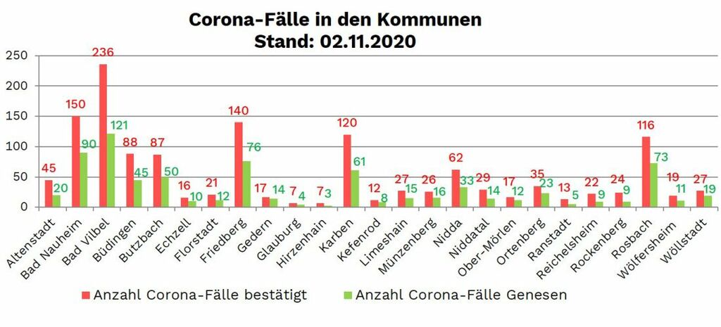 Die Zahl der seit Beginn der Pandemie nachgewiesenen Fälle von Corona-Infektionen im Wetteraukreis liegt am Dienstag (3. November) bei 1407, das sind 44 mehr als am Montag. Die Neuinfektionen wurden gemeldet aus Bad Nauheim (5), Bad Vilbel (6), Büdingen (3), Butzbach (5), Florstadt (1), Friedberg (6), Karben (1), Kefenrod (1), Münzenberg (1), Nidda (1), Niddatal (2), Rockenberg (3) Rosbach (5), Wölfersheim (2) und Wöllstadt (2).