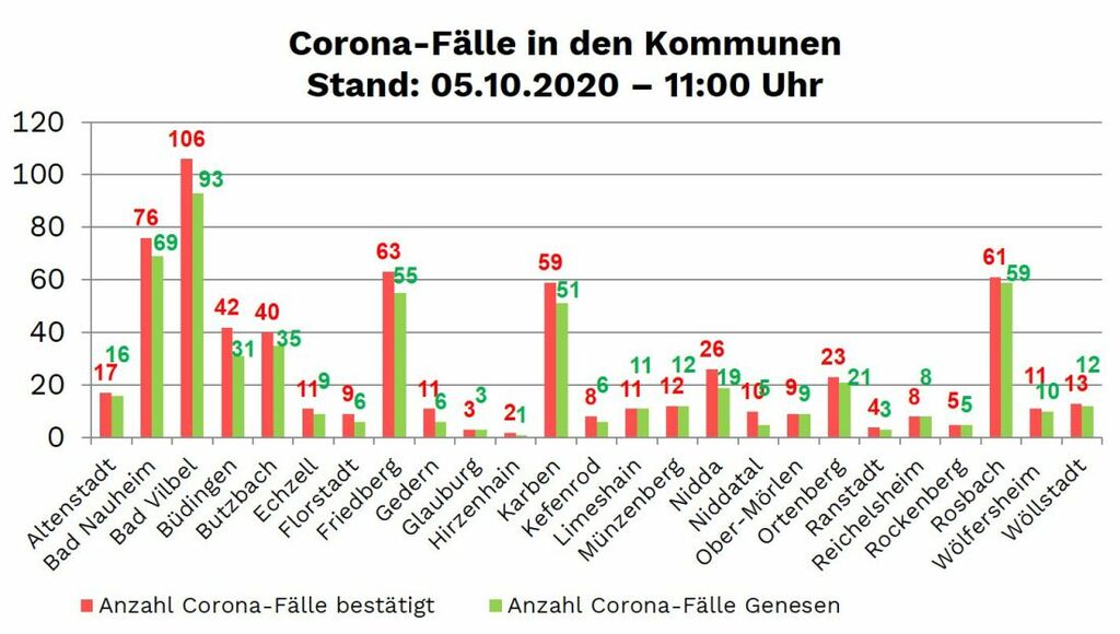 Die Zahl der seit Beginn der Pandemie nachgewiesenen Fälle von Corona-Infektionen im Wetteraukreis liegt am Montag, (5. Oktober) bei 640, das sind elf mehr als am vergangen Freitag. Die Neuinfektionen wurden aus Altenstadt (1), Bad Nauheim (1), Bad Vilbel (2), Büdingen (3), Gedern (1), Karben (1), Niddatal (1) und Wöllstadt (1) gemeldet.