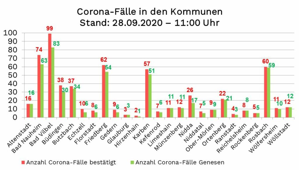 Die Zahl der seit Beginn der Pandemie nachgewiesenen Fälle von Corona-Infektionen im Wetteraukreis liegt am Montag, (28. September) bei 609, das sind 15 mehr als am Freitag. Die Neuinfektionen wurden aus Bad Nauheim (3), Bad Vilbel (3), Büdingen (5), Butzbach (1), Echzell (1), Friedberg (1) und Karben (1) gemeldet.