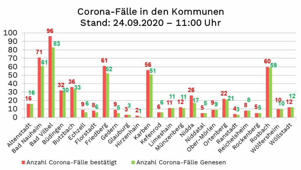 Die Zahl der seit Beginn der Pandemie nachgewiesenen Fälle von Corona-Infektionen im Wetteraukreis liegt am Freitag (25. September) bei 594, das sind fünf mehr als am Donnerstag. Die Neuinfektionen wurden aus Büdingen (1), Kefenrod (1), Niddatal (2) und Wölfersheim (1) gemeldet. Die Zahl der aus der Quarantäne entlassenen Menschen liegt bei 527, drei mehr als am Donnerstag. Die Genesenen kommen aus Bad Nauheim (2) und Friedberg (1).