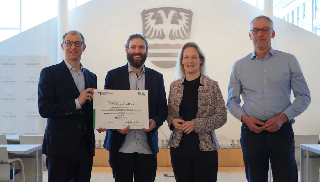 Von links: Landrat Jan Weckler, Projektverantwortlicher Konrad Laurin Wolf, Erste Kreisbeigeordnete Birgit Weckler und der Fachbereichsleiter für Regionalentwicklung und Umwelt, Christian Sperling, freuen sich darauf, das digitale Dorf voranzubringen. Foto: Wetteraukreis