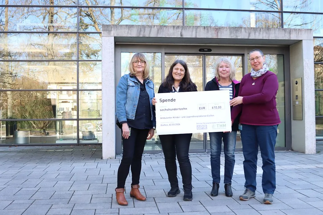 Astrid Michalowski (li.) und Christina Lindenstruth (re.) vom Örtlichen Personalrat Gießen und Wetzlar der THM überreichen Lisa Criseo-Brack (2.v.li.) und Anne Bernlöhr die Spende für die Arbeit des Ambulanten Kinder- und Jugendhospizdienstes in Gießen.