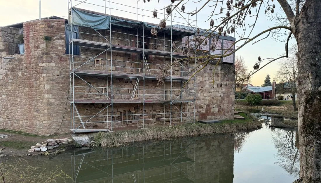 An der historischen Wasserburg Bad Vilbel werden derzeit weitere Abschnitte der östlichen Außenmauer denkmalgerecht instandgesetzt. Die Arbeiten sind Teil der kontinuierlichen Maßnahmen zur Sicherung und Erhaltung der mittelalterlichen Burganlage.