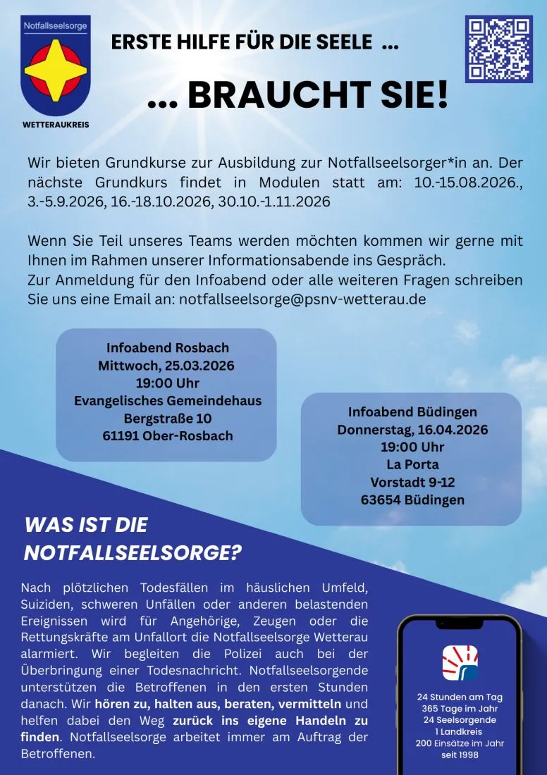 Die Notfallseelsorge Wetterau sucht engagierte Menschen, die sich ehrenamtlich in der Begleitung von Menschen in akuten Krisensituationen einsetzen möchten.