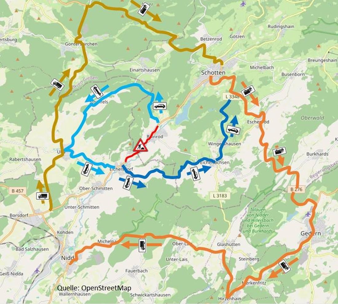 Um die Belastung auf den Umleitungsstrecken soweit es geht zu reduzieren, werden je nach Fahrtrichtung zwei getrennte Umleitungen ausgewiesen. Eine ausgeschilderte Umleitung führt die Verkehrsteilnehmenden von Schotten kommend über Stornfels, Ulfa nach Eichelsdorf. Von Eichelsdorf kommend führt die Umleitung dann über Eichelsachsen und Wingershausen nach Schotten. Die für den Schwerlastverkehr gesonderte weiträumige, ebenfalls richtungsgetrennte Umleitung bleibt ebenso bestehen.