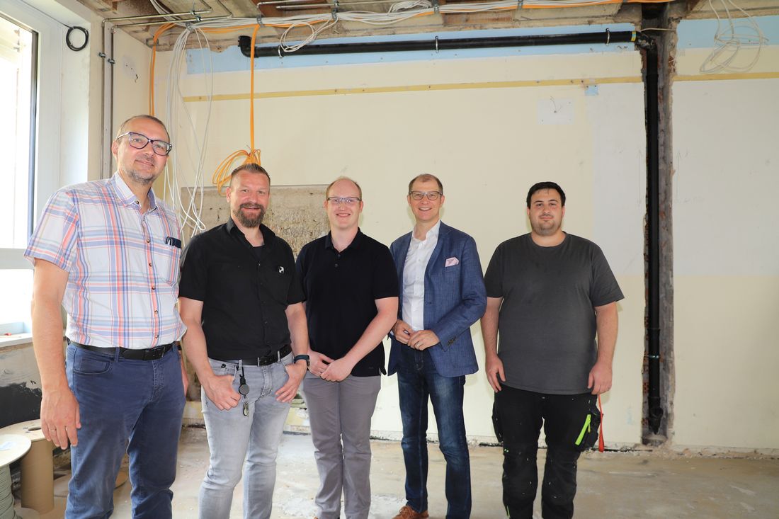 Umfangreiche Arbeiten stehen in verschiedenen Klassenräumen der Geschwister-Scholl-Schule in Niddatal-Assenheim derzeit auf dem Programm. Über den Stand der Arbeiten informiert sich Landrat Jan Weckler (2. von rechts) bei einem Baustellenbesuch gemeinsam mit Fachdienstleiter Hochbau, Alexander Hiemer (links), bei Gesamt-Projektleiter Kai Emmerich, Projektleiter Florian Abel und Hausmeister Timo Fritz (von links).