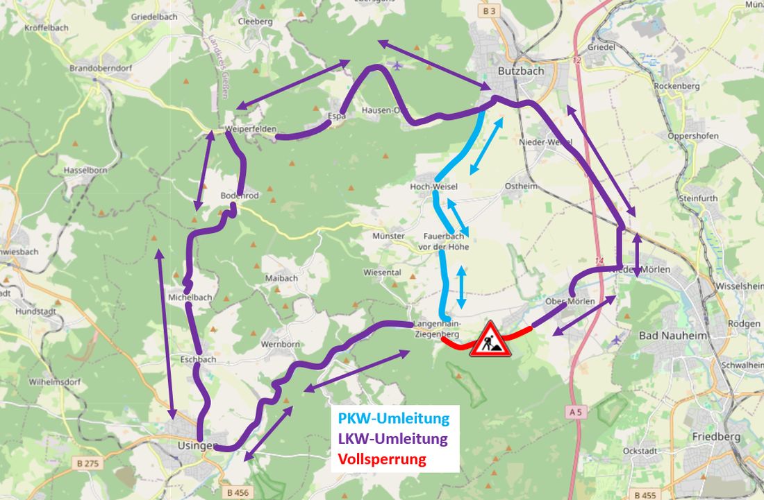 Diese sind teilweise stark witterungsabhängig, weshalb es hier zu zeitlichen Verschiebungen kommen kann. Der Verkehr wird wie aus dem letzten Jahr bekannt über die Landesstraße 3056 umgeleitet - also für beide Fahrtrichtungen über Hoch-Weisel und Fauerbach. Lastkraftwagen müssen wiederum eine größere Ausweichroute über u.a. Weiperfelden und Usingen befahren. Der Hessische Radfernweg 6 bleibt wie zuvor von den Einschränkungen unberührt. Gleiches gilt für die A5-Anschlusstelle "Ober-Mörlen".
