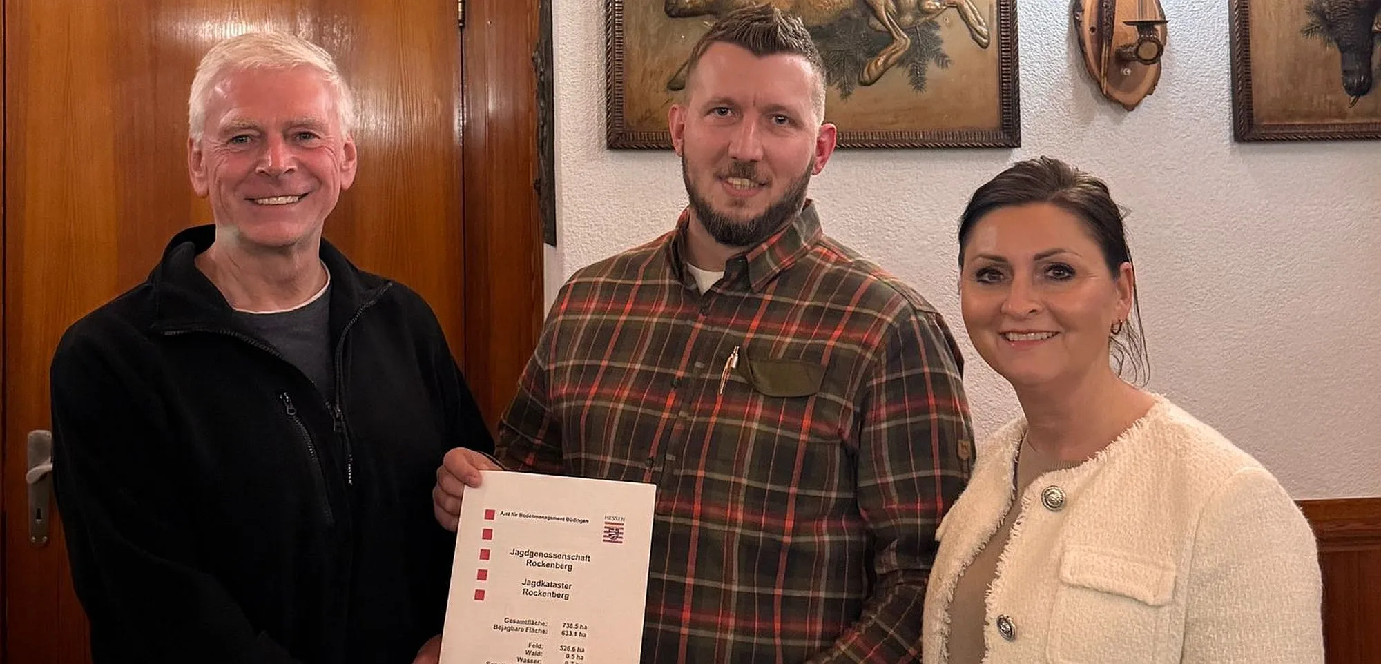 Steffen Weil (Mitte) ist der neue Jagdpächter der Gemarkung Rockenberg. Hier zu sehen mit Rockenbergs Bürgermeisterin Olga Schneider (rechts) und Martin Wettner Vorsitzender der Jagdenossenschaft (links).