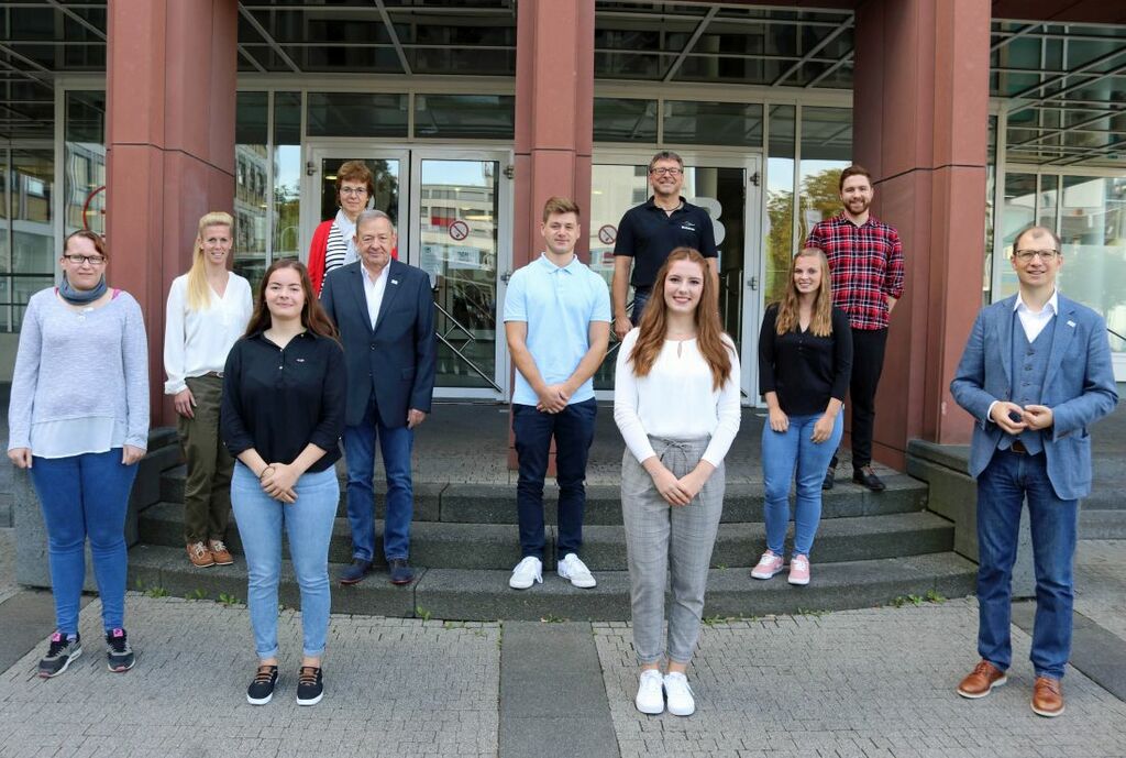 Foto: Der neue Jahrgang der Auszubildenden. Von links: Claudia Klose (Azubi Gebäudereinigerin), Dana Christmann (Fachdienst Personal), Leah Schäfer (Bachelor of Arts - Public Administration), Kornelia Schäfer (Frauenbeauftragte), Michael Kipper, Leiter der Fachstelle Personalgewinnung und -betreuung, Joshua Rüfer (Azubi Verwaltungsfachangestellter), Georg Wetz (Fachdienst Personal), Jessica Thorwarth und Felizitas Gies (beide Bachelor of Arts - Public Administration), Jan-Lukas Staack (Bachelor of Arts - Public Administration) Landrat Jan Weckler.