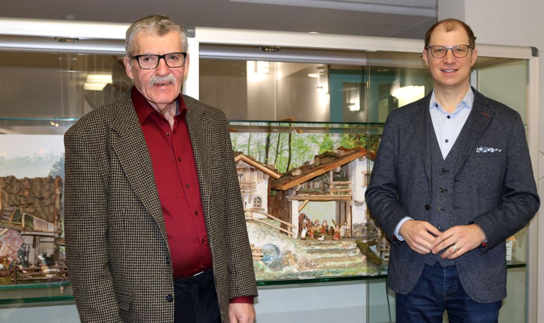 Bild 1: Alpenländischer Zauber im Kreishaus: Landrat Jan Weckler und Krippenbauer Siegfried Rauch vor den Vitrinen mit den beiden Krippen. Foto: Wetteraukreis
