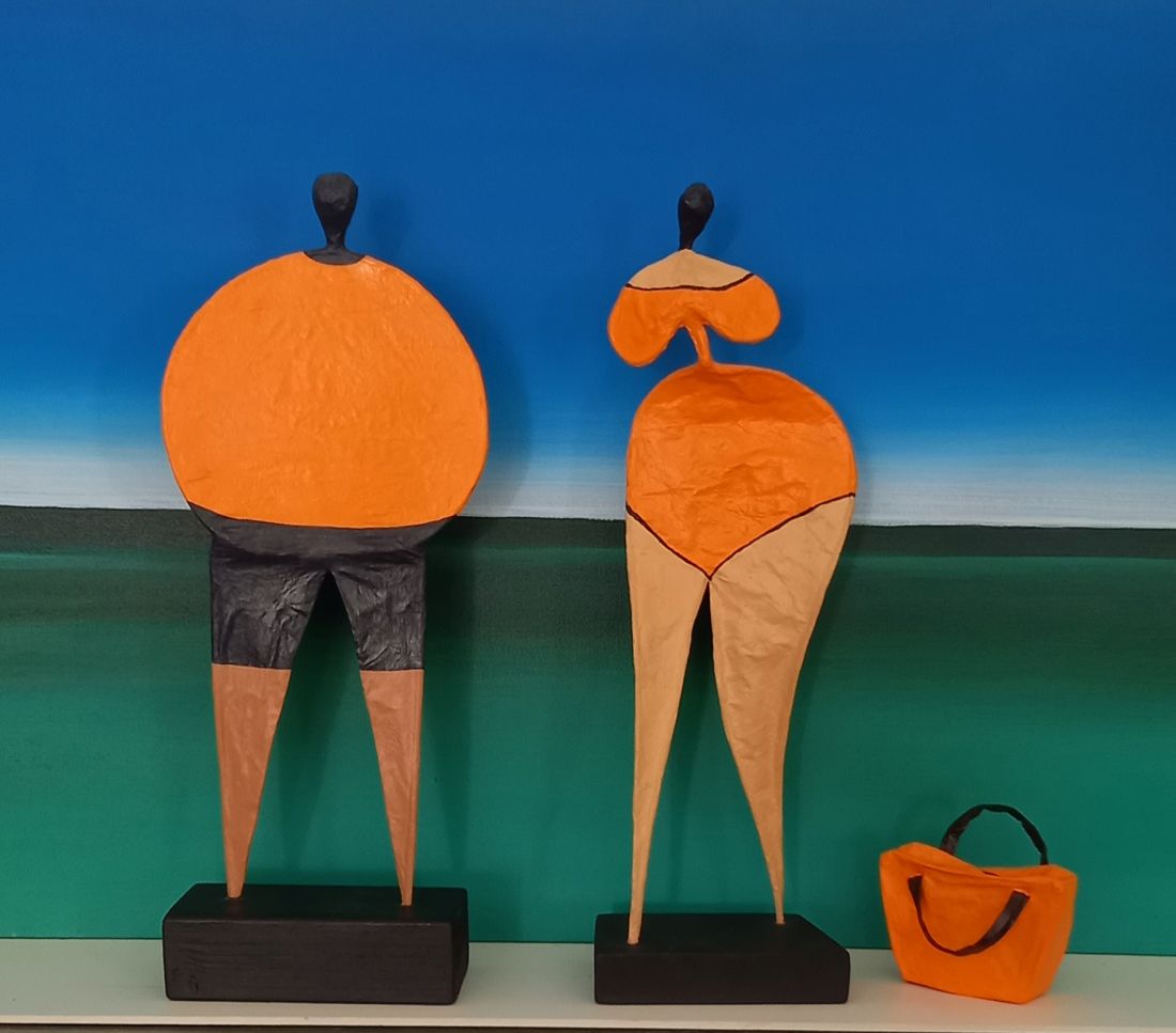 Aus einem Stück Draht geformt und gebogen, meist mit segelartigen Papierleibchen bekleidet, bringt die Künstlerin Ursula Rickert-Rieb verschiedene Charaktere ihrer Figuren auf den Punkt.