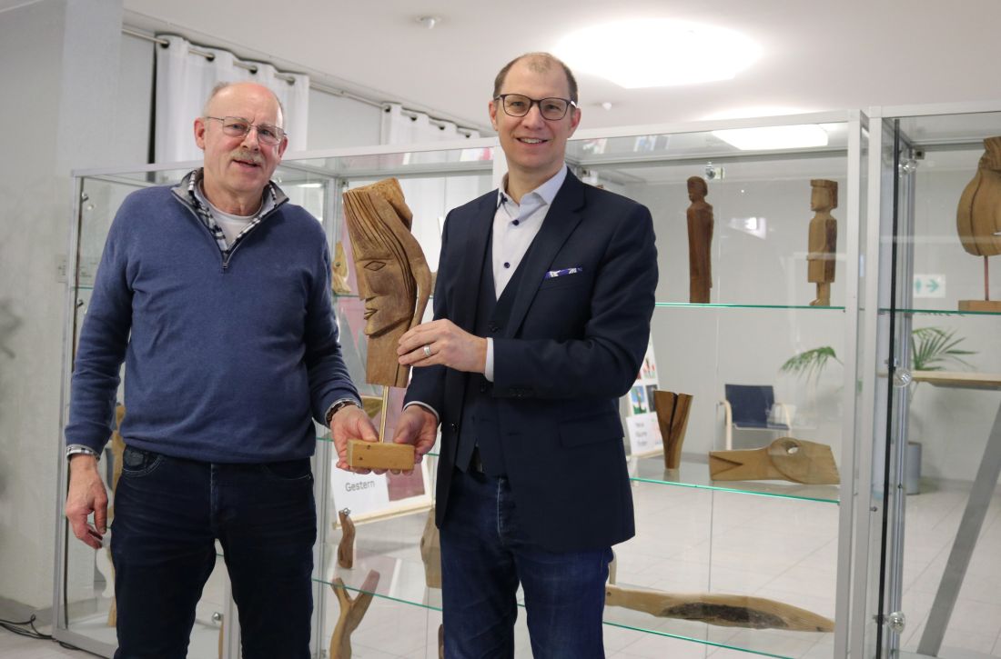 Landrat Jan Weckler bedankte sich bei Albert Bodenröder für die Ausstellung. „Man sieht bereits an der Auswahl der einzigartigen Hölzer, wie er mit gekonntem Blick besondere Maserungen und eindrucksvolle Formen heraussucht. Mit seinem kreativen Können und seiner handwerklichen Begabung entstehen dann diese Kunstobjekte mit ihren individuellen Geschichten, die wir gerne im Kreishaus präsentieren."