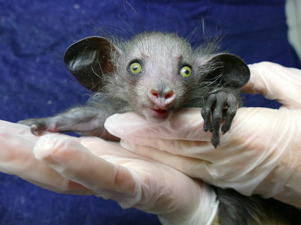 Fingertiere, auch Aye-Aye genannt, sehen aus wie Fabelwesen mit ihren markanten Augen, dem buschigen Schwanz und dem dünnen Mittelfinger mit der langen Kralle, der ihnen als Werkzeug bei der Futtersuche dient. Am 26. Oktober gab es im Grzimekhaus des Frankfurter Zoos Nachwuchs bei den seltenen Primaten.