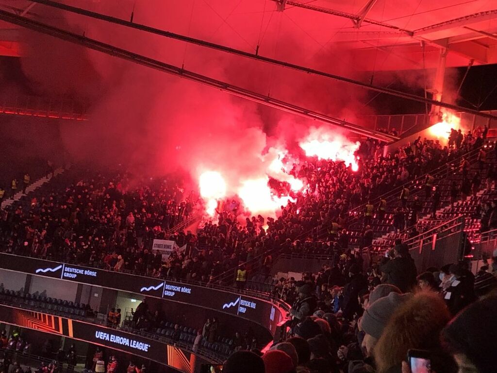 In der 2. Halbzeit wurden im Gästeblock Unmengen von Pyrotechnik gezündet. Ein Bengalo wurde dabei in die Zuschauermenge geworfen, wodurch ein Besucher schwer verletzt wurde. Der Täter, ein belgischer Fan ohne festen Wohnsitz, wird heute im Laufe des Tages einem Haftrichter vorgeführt. Auch im Bereich der Heimkurve wurden durch die Frankfurter Fans drei Böller in den Innenraum geworfen, wodurch einige Ordner verletzt wurden.