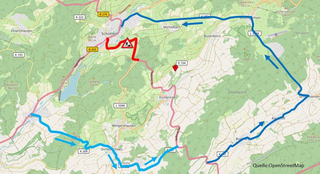 Dementsprechend schließt die Vollsperrung auch die Einmündung B 276/L 3348 ein und bleibt bis aller Voraussicht nach Anfang Mai 2024 erforderlich. Für den überörtlichen Verkehr aus Richtung Nidda erfolgt währenddessen die Umleitung über Rainrod nach Eichelsachsen und von dort direkt zur B 276 in Richtung Gedern. Für den Verkehr aus Richtung Gedern verläuft die überörtliche Umleitungsstrecke wie schon angekündigt über Burkhards, Kaulstoß, Sichenhausen und Breungeshain wieder nach Schotten.