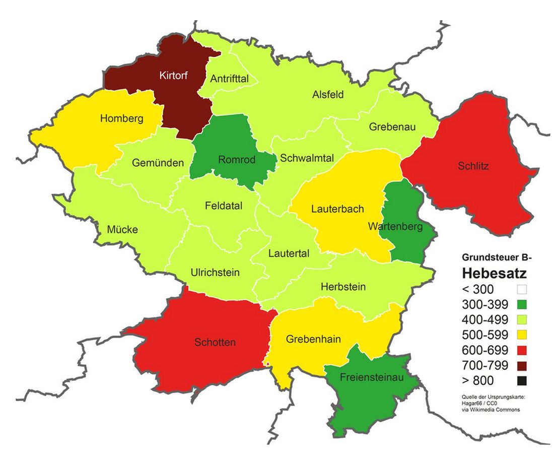 Bei der Grundsteuer A, die land- und forstwirtschaftlich genutzte Flächen besteuert, steigerten ebenfalls Kirtorf (+375), Homberg (+160) und Gemünden (+37) ihre Hebesätze. Mit nun 795 Prozent liegt Kirtorf auch hier an der Spitze aller Kommunen im Vogelsberg. Freiensteinau und Wartenberg haben mit je 332 Prozent kreisweit die niedrigste Belastung. Mit einem durchschnittlichen Hebesatz von 484 Prozent (25 Punkte mehr als im Vorjahr) liegen die Kreiskommunen weiter über dem hessischen Vorjahres-Durchschnitt von 441 Prozent.