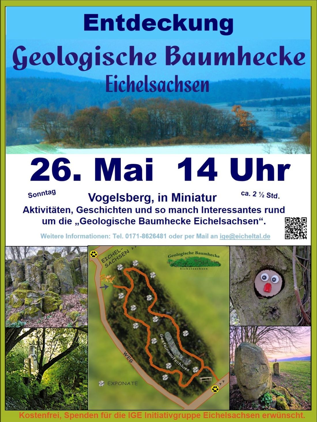 Das neue Event der IGE Initiativ-Gruppe-Eichelsachsen findet am Sonntag, den 26.05.2024, um 14:00 Uhr in der „Geologischen Baumhecke“ am südlichen Ortsrand von Eichelsachsen (Richtung Glashütten) in der gut 100 Meter langen und 20 Meter breiten Hecke ein ca. 2½-stündige Erlebnisreiches Event statt.