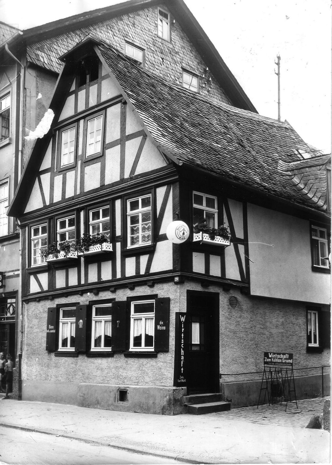 Gaststätte „Zum kühlen Grund“ um 1930 Später „Schoppenstübchen“. Griedelerstr. 29 abgerissen 2011.Links davon die Gaststätte „Zum alten Fritz“. Quelle: Stadtarchiv Butzbach