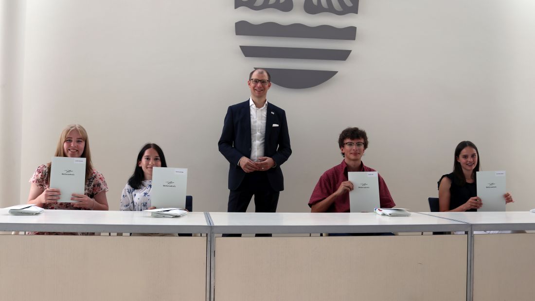 Foto: (von links) Leonie Kammer, Hanna Springer, Landrat Jan Weckler, Moritz Wirl und Lina Gloria Maier. Copyright Wetteraukreis