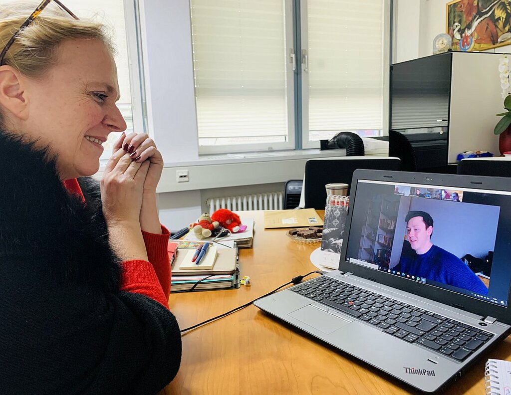 Foto: Erste Kreisbeigeordnete Becker-Bösch im Online-Gespräch mit Luca Tom Bauer. Bauer ist in der Koordinierungs- und Fachstelle ab sofort Ansprechpartner für Jugendliche.