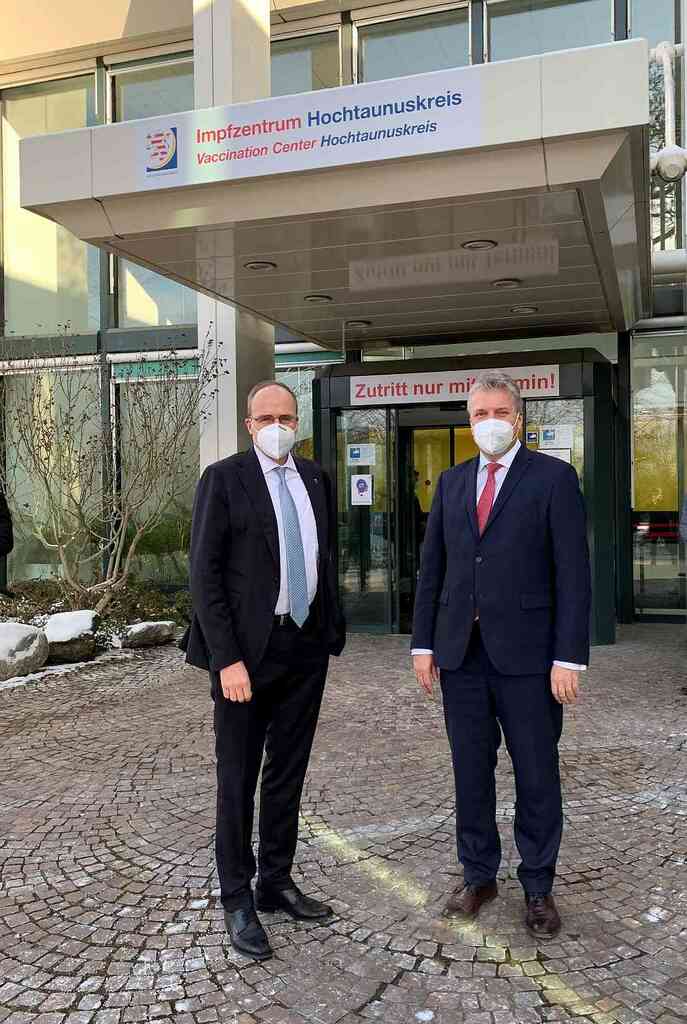 Anlässlich der Öffnung aller 28 Impfzentren in Hessen hat Innenminister Peter Beuth die jeweiligen Einrichtungen des Hochtaunus- und des Wetteraukreises besucht. Gemeinsam mit den Landräten der Kreise machte sich Peter Beuth jeweils ein Bild vom gelungenen Auftakt in Bad Homburg (Hochtaunuskreis) und Büdingen (Wetteraukreis).