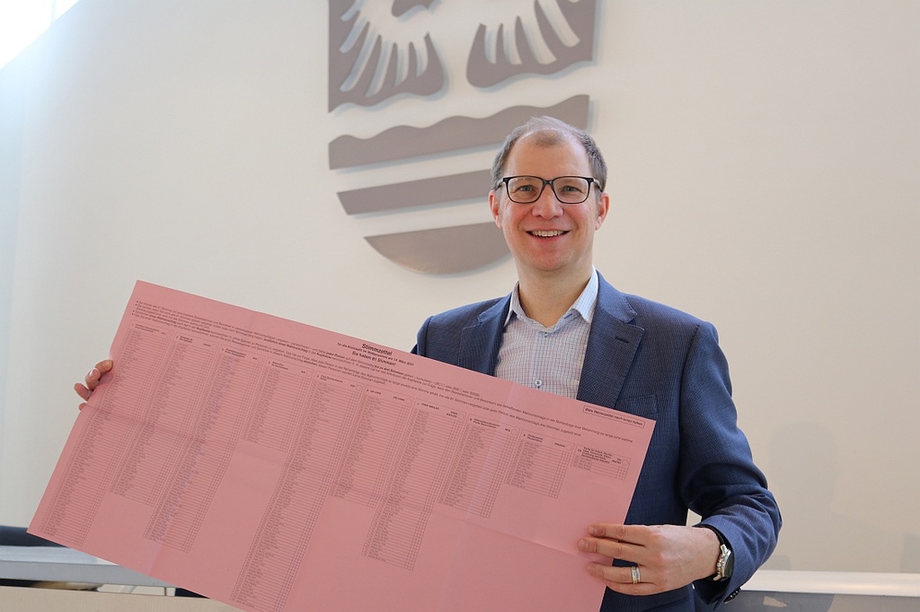 Foto: Landrat Jan Weckler mit dem Wahlzettel zur Kreistagswahl.