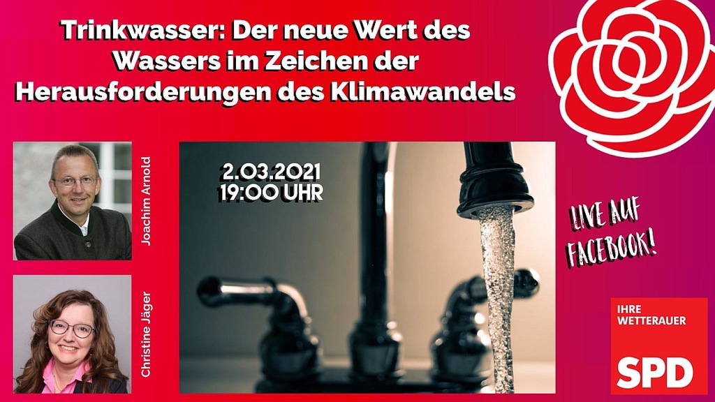 Trinkwasser: Der neue Wert des Wassers im Zeichen der Herausforderung des Klimawandels. Unter diesem Thema lädt die SPD Wetterau zu einer Online-Veranstaltung am 2. März 2021 um 19 Uhr.
