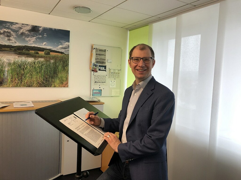 Foto: Landrat Jan Weckler mit dem Genehmigungs-Erlass des Hessischen Kultusministeriums für den Schulentwicklungsplan Förderschulen.