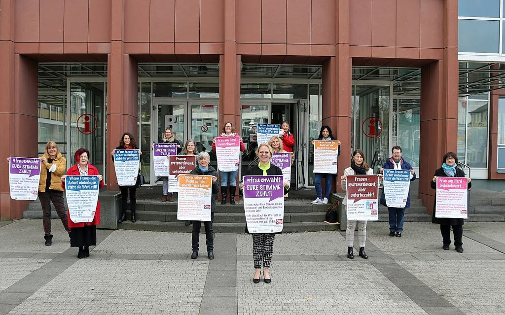 Wer am 8. März auf der Kaiserstraße etwas erledigt, wird nicht umhin können über einige große, bunte Bodenaufkleber zu stolpern. „Frauen wählt - Eure Stimme zählt! oder „Frauen – systemrelevant, aber unterbezahlt!“ ist da zu lesen. Das Wetterauer Aktionsbündnis macht zum 8. März mit einer groß angelegten Bodenaufkleberaktion auf die Rechte von Frauen und noch bestehende Benachteiligungen aufmerksam.