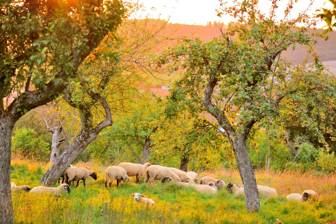 Schafe und Streuobst ergänzen sich gut, sodass die Projekte des gastgebenden Landschaftspflegeverbands Naturschutzfonds Wetterau e.V. (NFW) zahlreiche Synergieeffekte bieten. Diese stellten die Mitarbeiterinnen (NFW) und Projektpartner im Rahmen der Exkursion vor. Foto: Karl-Hermann Heinz
