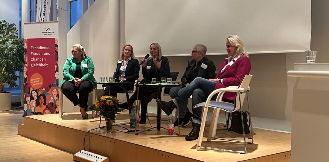 Anlässlich des 75. Jubiläums des Gleichberechtigungsgrundsatzes im Grundgesetz fand im Plenarsaal des Friedberger Kreishauses die Veranstaltung „75 Jahre Gleichberechtigung im Grundgesetz und Frauen in der Politik“ statt. Birgit Weckler (CDU), Annette Wetekam (CDU), Nathalie Pawlik (SPD), Henrike Strauch (SPD) und Isil Yönter (Bündnis 90/Die Grünen) tauschten sich über Gleichberechtigung und Zusammenarbeit von Frauen in der Politik aus.
