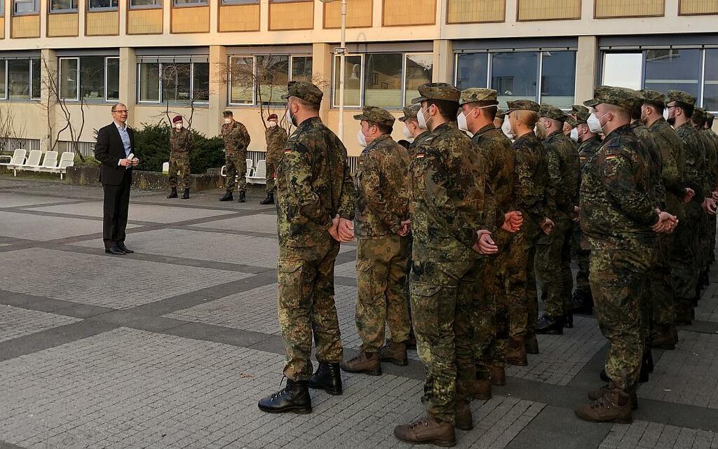 Der Wetteraukreis habe zwar keine klassische Bundeswehrhistorie mit größeren Standorten gehabt, dafür blicke man aber auf eine Geschichte in der Bundesrepublik zurück, bei der vor allem die Stationierung amerikanischer Soldaten in der Zeit des Kalten Krieges die Region geprägt habe. Insbesondere der berühmteste US-Soldat in Friedberg und Bad Nauheim, Elvis Presley, der vor rund 60 Jahren hier stationiert war, präge nach wie vor die Erinnerungskultur. Insofern sei es immer noch eine Besonderheit, wenn Soldaten der Bundeswehr im Feldanzug vor der Kreisverwaltung Aufstellung nähmen. „Das zeugt davon, dass wir derzeit in einer außergewöhnlichen Situation sind“, so Landrat Jan Weckler. Erst kürzlich wurde an gleicher Stelle eine Einheit aus Nordrhein-Westfalen in die Heimat verabschiedet. Sowohl die „Westfalen“ als auch die „Norddeutschen“ werden den Wetteraukreis nach eigenem Bekunden in sehr guter Erinnerung behalten.