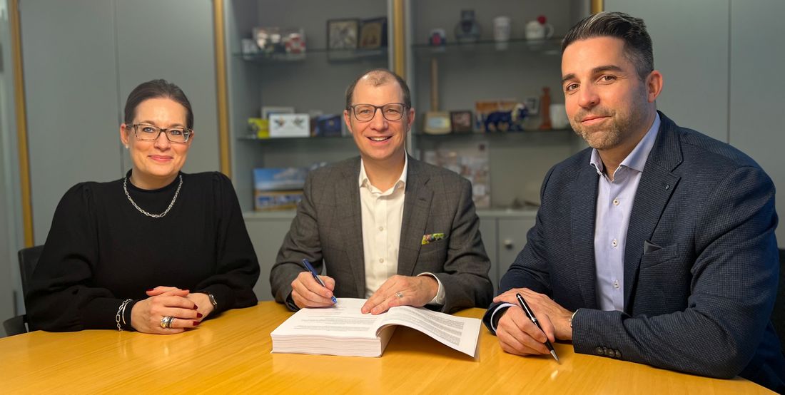 Landrat Jan Weckler (Mitte) bei der Vertragsunterzeichnung mit Tobias Pflüger, Geschäftsführer der HORN & COSIFAN GmbH und Katja Müller-Lind, Fachdienstleitung Schul-IT und Einrichtungen des Wetteraukreises.