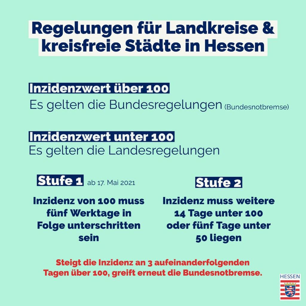 Das Kabinett der Hessischen Landesregierung hat am Mittwoch über das weitere Vorgehen in der Corona-Pandemie beraten und neue Regelungen in einem Stufenplan festgelegt. Diese werden schrittweise gelten, sobald in einem Landkreis oder einer kreisfreien Stadt die Inzidenz an fünf aufeinander folgenden Werktagen unter 100 sinkt und die Maßnahmen der Bundesnotbremse dort nicht mehr greifen.