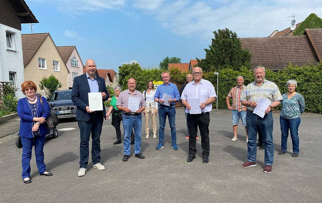 Bild: Kreisbeigeordneter Matthias Walther und Florstadts Bürgermeister Herbert Unger mit Mandatsträgern bei der Bescheidübergabe in Nieder-Mockstadt. Von links: Brigitte Barth (Magistrat), Kreisbeigeordneter Matthias Walther, Gudrun Neher (Fraktionsvorsitzende Bündnis 90/Die Grünen), Karl-Gerhard Stiebeling (Ortsbeirat Nieder-Mockstadt), Gunda Hofmann (Ortsbeirat), Stephan Mickel (Ortsvorsteher Nieder-Mockstadt, Joachim Heuser (Leiter der Bauverwaltung), Bürgermeister Herbert Unger, Dietmar Schmidt (Ortsbeirat Nieder-Mockstadt), Horst Schmidt (Ortsvorsteher vom Ortsbeirat Stammheim), Maria Groß (Ortsbeirat Nieder-Mockstadt).