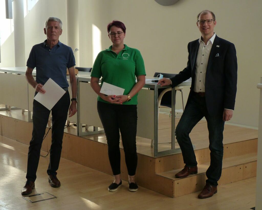 Foto: Christina Geschke vom Schützenverein 1928 e.V. (Bildmitte) zusammen mit Sportkreisvorsitzendem Jörg K. Wulf und Landrat Jan Weckler bei der Bescheidübergabe.
