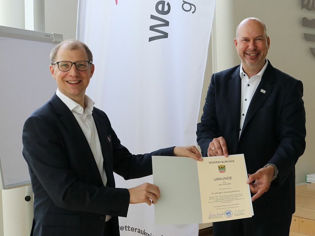 Im Rahmen einer Sitzung des Kreisausschusses hat Kreisbeigeordneter Matthias Walther dieser Tage die Urkunde zum 25-jährigen Dienstjubiläum an Landrat Jan Weckler (CDU) übergeben. Walther würdigte in diesem Zusammenhang die 25 Jahre im öffentlichen Dienst und stellte den Lebens- und Dienstweg des heutigen Landrats heraus.