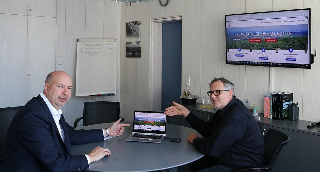 Foto: Kreisbeigeordneter Matthias Walther lässt sich von Heiko Franke die Möglichkeiten erläutern, die mit der Mitgliedschaft des Wetteraukreises in der Arbeitsgemeinschaft GDI Südhessen verbunden sind.