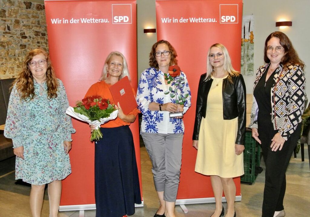 MüFaZ Bad Nauheim v.l.: SPD Fraktionsvorsitzende Christine Jäger, Ute Latzel und Tanja Oberwallner vom Mütter- und Familienzentrum e.V. Bad Nauheim, Bundestagskandidatin Natalie Pawlik und die Wetterauer Landtagsabgeordnete und Vorsitzende der Wetterauer SPD Lisa Gnadl