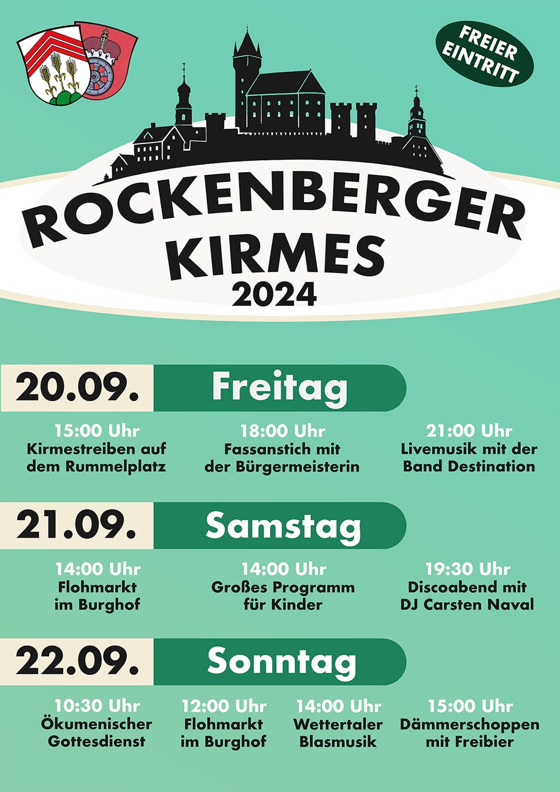 Obergassen-Kirmes in Rockenberg 2024! Für den Kalender: Die Gemeinde Rockenberg lädt vom 20. bis 22. September zur Obergassen-Kirmes ein. Die Kirmes findet im Herzen der Gemeinde statt – umringt vom Rathaus, der historischen Burg Rockenberg und dem Freien Platz. Für Musik sorgen am Kirmes-Wochenende die Band „Destination“, DJ Carsten Naval und „Die Wettertaler“.