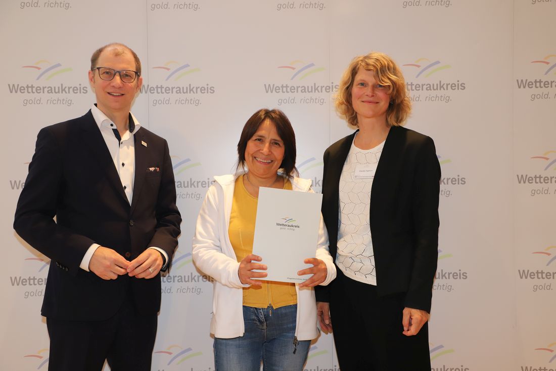 Carmen Mercedes Ruiz (Mitte) bei der Urkundenübergabe mit Landrat Jan Weckler (links) und Claudia Taphorn (rechts), Fachdienst Frauen und Chancengleichheit.