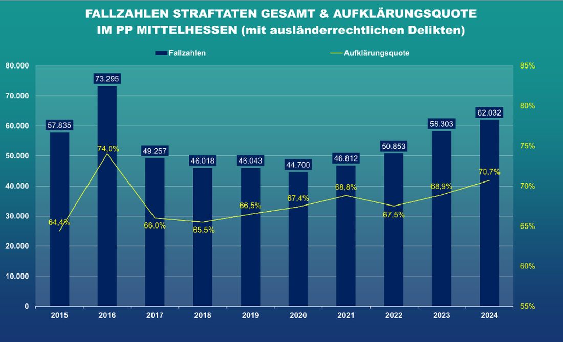 Das sind im Vergleich zum Vorjahr 657 Straftaten weniger. Ein ebenfalls erfreulicher Rückgang ist bei den registrierten Straftaten pro 100.000 Einwohner (Häufigkeitszahl) von 4.470 im Jahr 2023 auf 4.391 im Jahr 2024 festzustellen. Darüber hinaus spiegelt sich die kontinuierlich hohe Arbeitsleistung aller Polizeibeamtinnen und Polizeibeamten in Mittelhessen in einer erneut hohen Aufklärungsquote wider. Diese ist leicht von 63,2 Prozent im Jahr 2023 auf 62,6 Prozent gesunken, jedoch im landes- respektive bundesweiten Vergleich nach wie vor außerordentlich.