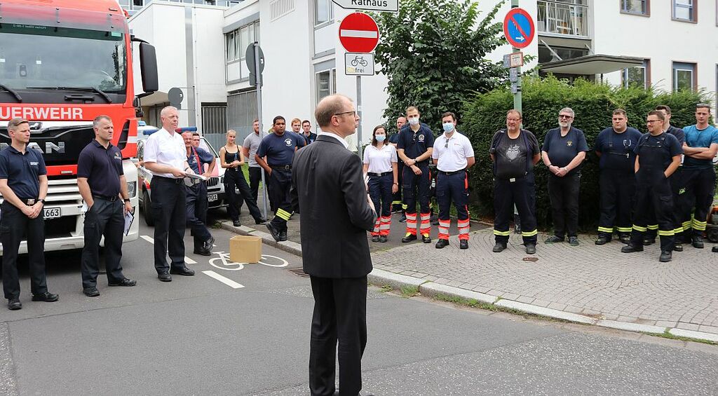 Landrat Jan Weckler dankte den 34 Feuerwehrmännern und -frauen für ihre Einsatzbereitschaft. „Heute Morgen hatten Sie noch ganz andere Pläne für den Tag und die Woche. Dann kam der Einsatzbefehl und innerhalb weniger Stunden waren Sie bereit dort zu helfen, wo man Sie braucht. Überall in ganz Deutschland machen sich jetzt Freiwillige aus Feuerwehr, den Rettungsdiensten und dem THW auf den Weg ins Katastrophengebiet, zu einem Einsatz der auch Gefahren mit sich bringt, schon mehrere Feuerwehrleute sind bei dem Einsatz umgekommen. Deshalb meine Bitte an Sie: Kommen Sie gesund zurück!“