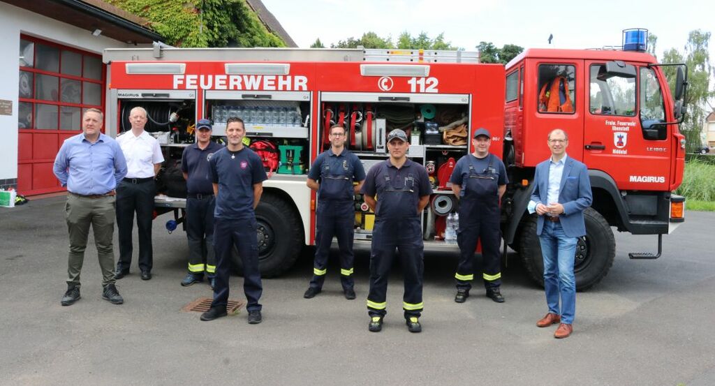 Foto (von links): Bürgermeister Michael Hahn, Kreisbrandinspektor Lars Henrich, Patrick Dauth, Patrick Limbach, Jörn Erlenmaier, Christian Behnken, Simon Schulmeier, und Landrat Jan Weckler.