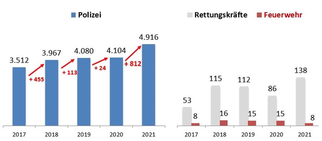 Seit vielen Jahren steigen die Angriffe auf Polizistinnen und Polizisten kontinuierlich an. Obwohl auch 2021 größere Volksfeste und Veranstaltungen ausfielen, nahmen im vergangenen Jahr Angriffe / Widerstandshandlungen gegen Polizistinnen und Polizisten um fast 20 Prozent drastisch zu. 2021 wurden insgesamt 4.916 Polizeibeamte Opfer einer Straftat. In 2.450 Fällen waren sie gar Ziel tätlicher Angriffen und Widerstandshandlungen. Dies entsprach einer Zunahme von 401 Fällen (+ 19,6 Prozent). Damit erreichen sowohl die Fall- als auch die Opferzahlen im Bereich der Gewaltkriminalität gegen Polizeivollzugsbeamte erneut Höchstwerte. Auch die Anzahl von Angriffen auf Rettungskräfte (2020: 86) stieg auf 138 Opfer deutlich an. Acht Feuerwehrleute meldeten im vergangenen Jahr Übergriffe.