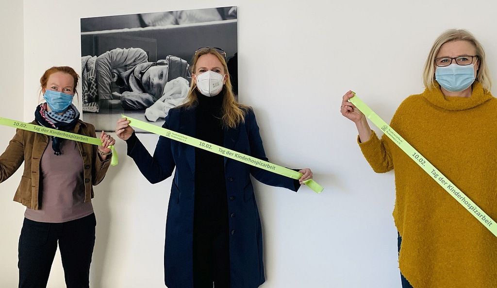 Foto: Nadine Bauer, Geschäftsführerin des Vereins und Charlotte Junker übergeben zum „Tag des Kinderhospizes“ das grüne Band an Erste Kreisbeigeordneter Stephanie Becker-Bösch.