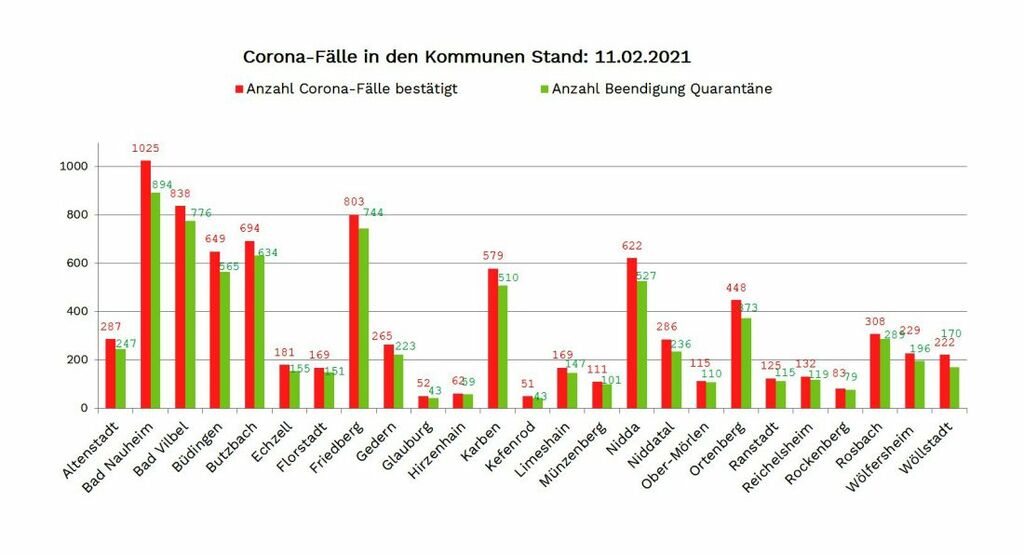 Die Neuinfektionen wurden gemeldet aus: Altenstadt (2), Bad Nauheim (9), Bad Vilbel (10), Büdingen (5), Butzbach (3), Echzell (2), Florstadt (2), Friedberg (2), Gedern (1), Glauburg (1), Karben (3), Nidda (3), Niddatal (1), Ober Mörlen (2), Ortenberg (3), Reichelsheim (1), Rosbach (2), Wölfersheim (3) und Wöllstadt (5). Die aus der Quarantäne entlassenen Personen wurden gemeldet aus: Altenstadt (3), Bad Nauheim (1), Bad Vilbel (2), Büdingen (1), Butzbach (4), Echzell (5), Friedberg (4), Gedern (4), Hirzenhain (1), Karben (3), Kefenrod (1), Limeshain (1), Nidda (1), Niddatal (1), Rockenberg (2), Rosbach (1) und Wölfersheim (3).